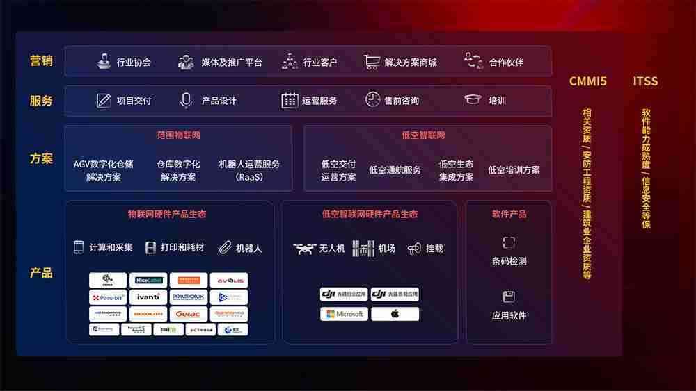 聚合国内外先进的物联网硬件产品品牌,,聚焦数字化仓储、、、机器人运营、、、、低空智联网等领域,,,共同打造适合客户业务场景的解决方案并提供交付服务